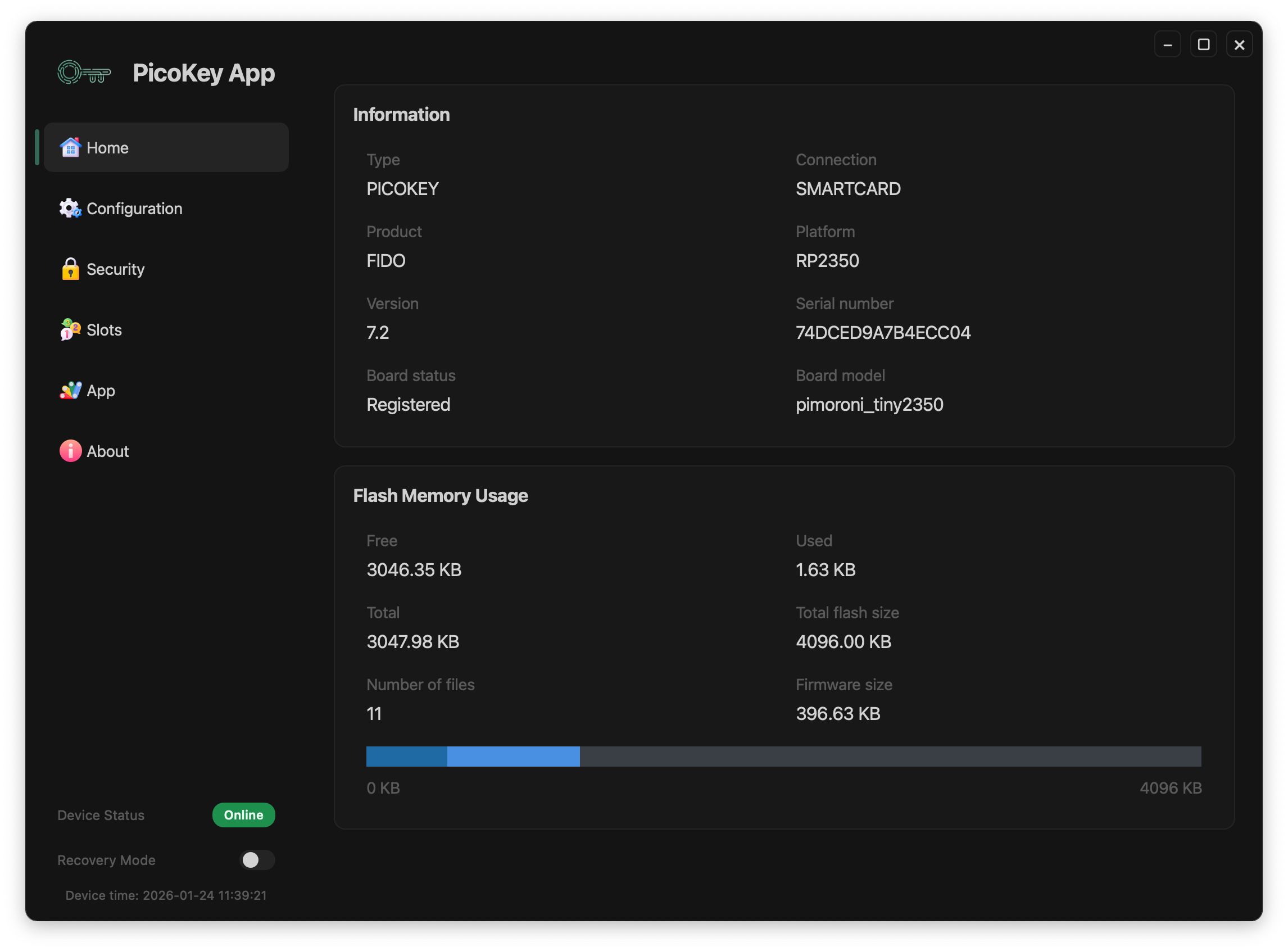While the firmware running on the device is fully functional and open, certain hardware-specific aspects cannot be determined at build time and must be configured on the target board. PicoKey App provides the missing link between a generic firmware image and a fully operational, board-specific device.